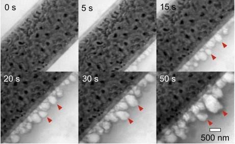 三角標記為正在生長的鋰枝晶,鋰枝晶是造成鋰電池內(nèi)部短路的常見原因