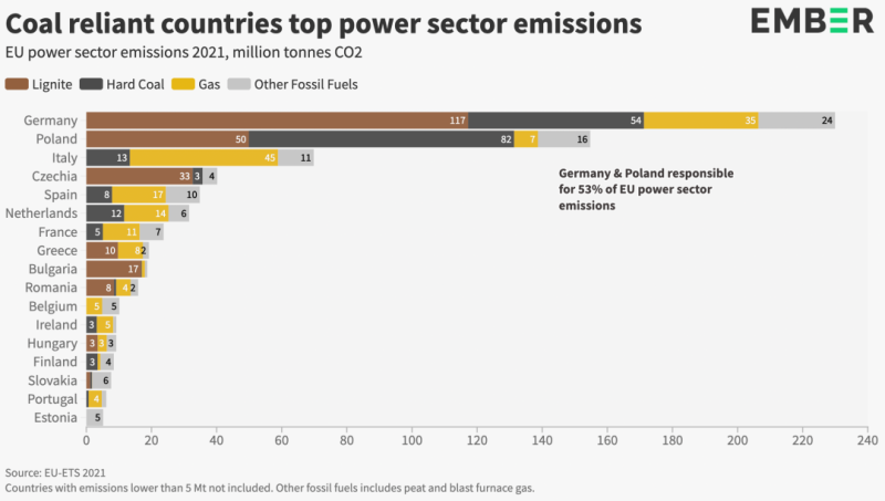 2021年德國(guó)和波蘭占?xì)W盟電力部門(mén)的排放的53%。在波蘭,電力部門(mén)85%的排放來(lái)自煤炭。目前,德國(guó)電力行業(yè)75%的排放來(lái)自硬煤和褐煤電廠。與波蘭不同的是,德國(guó)承諾到2035年實(shí)現(xiàn)電力脫碳,最近還發(fā)布了雄心勃勃的計(jì)劃,期望將清潔能源份額從目前的40%提高到2030年的80%。