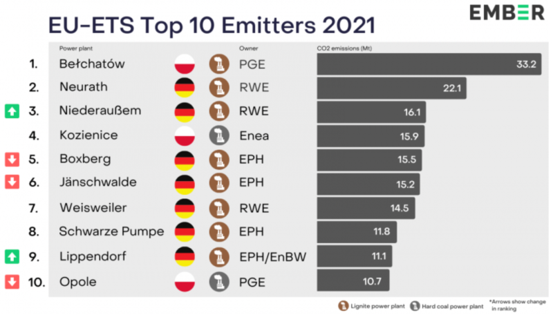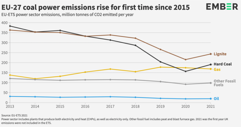 在歐盟電力行業(yè),油價(jià)上漲導(dǎo)致煤炭在2021下半年變得更具經(jīng)濟(jì)競(jìng)爭(zhēng)力,增加了褐煤和硬煤電廠發(fā)電量。2021年,歐盟的天然氣發(fā)電量下降了5%,煤電增長(zhǎng)了20%,因?yàn)槊禾吭诮?jīng)濟(jì)上更加有利。隨著新冠疫情后的經(jīng)濟(jì)反彈,2021年歐盟電力部門(mén)的排放量增加了10%,達(dá)到7.2億噸。2021年煤炭排放量上升了17%,是自EU-ETS自2005開(kāi)始以來(lái)的最大增幅,也是自2015以來(lái)的首次增長(zhǎng)。煤炭排放量的增加導(dǎo)致排放歐盟國(guó)家二氧化碳排放比2020年多6200萬(wàn)噸,其中4900萬(wàn)噸來(lái)自德國(guó)和波蘭。硬煤和褐煤電廠的排放占ETS排放總量的31%,高于2020年的29%。