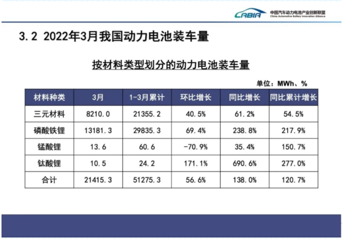分類別來看,3月三元電池共計裝車8.2GWh,占總裝車量38.3%,同比上升61.2%,環(huán)比上升40.5%;磷酸鐵鋰電池共計裝車13.2GWh,占總裝車量61.6%,同比上升238.8%,環(huán)比上升69.4%。產(chǎn)量方面,3月三元電池產(chǎn)量15.6GWh,占總產(chǎn)量39.7%,同比增長167.3%,環(huán)比增長33.8%;磷酸鐵鋰電池產(chǎn)量23.6GWh,占總產(chǎn)量60.2%,同比增長332.9%,環(huán)比增長17.6%??梢姛o論裝車量還是產(chǎn)量,相較三元電池,磷酸鐵鋰電池增速都明顯更高。