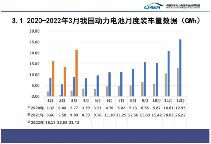 具體來看,3月我國動力電池裝車量達21.4GWh,同比上漲138%,環(huán)比增長56.6%。這與3月新能源汽車整體銷量情況大體一致。據(jù)中汽協(xié)數(shù)據(jù),3月新能源汽車銷量為48.4萬輛,同比增長1.1倍。