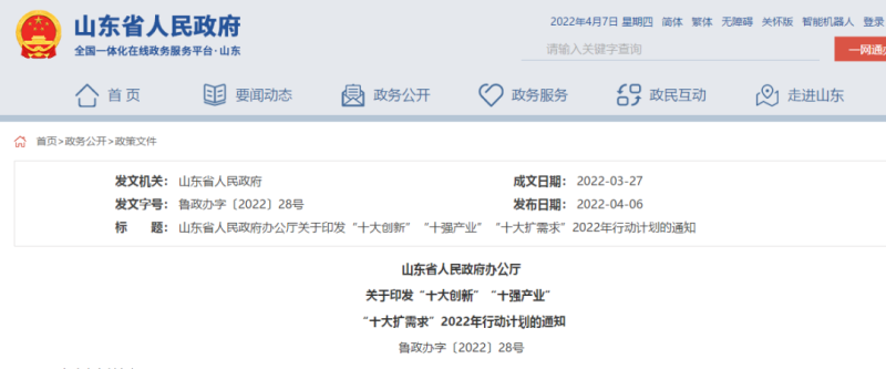 山東省人民政府辦公廳關(guān)于印發(fā)“十大創(chuàng)新”“十強(qiáng)產(chǎn)業(yè)”“十大擴(kuò)需求”2022年行動計(jì)劃的通知