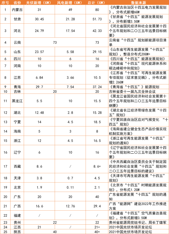 在國家層面政策推動的同時,各省地方“十四五”規(guī)劃對分布式光伏也提出了較為明確的目標(biāo),內(nèi)蒙要求新增6GW、甘肅要求新增3.5GW、江蘇要求2.26GW、福建要求3.5GW、山東更是提出了20GW的規(guī)劃。