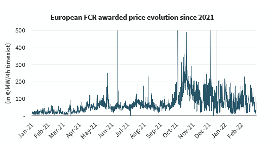 (2)頻率調(diào)節(jié)市場(chǎng)由一次性承諾組成的,即在一年中的任何一天的特定時(shí)間段內(nèi)遵循電網(wǎng)系統(tǒng)的操作指令(頻率遏制服務(wù)的持續(xù)時(shí)間為四個(gè)小時(shí),自動(dòng)頻率恢復(fù)儲(chǔ)備服務(wù)的持續(xù)時(shí)間為1小時(shí))。相關(guān)收入通過管理平臺(tái)上的拍賣系統(tǒng)確定。因此,已經(jīng)承諾進(jìn)入容量市場(chǎng)的儲(chǔ)能系統(tǒng)能夠在提供這些服務(wù)的時(shí)間之外進(jìn)行投標(biāo)。在2021年1月至2022年2月期間,頻率遏制服務(wù)的價(jià)格變化很大,4小時(shí)的可用性從100歐元/MW到1,600歐元/MW不等。