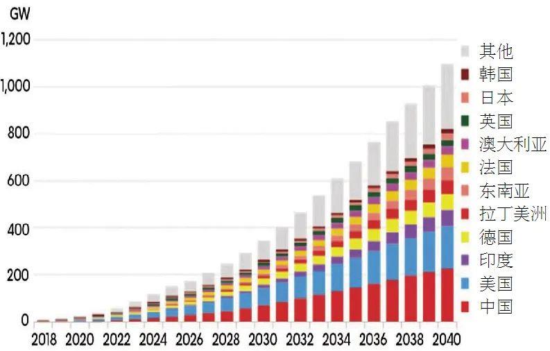 2018—2040年全球不同國(guó)家的累計(jì)儲(chǔ)能裝置量 Bloomberg NEF(彭博新能源財(cái)經(jīng))/供圖