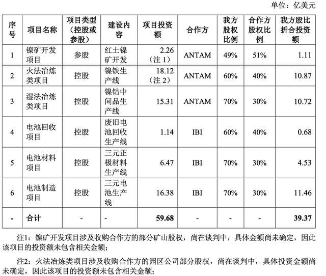 具體來(lái)看,6個(gè)子項(xiàng)目分別圍繞鎳礦開(kāi)采和電池生產(chǎn)兩大塊。其中,與ANTAM合作的三個(gè)項(xiàng)目為鎳礦開(kāi)發(fā)、火法冶煉類、濕法冶煉類,與IBI合作的三個(gè)項(xiàng)目為電池回收、電池材料和電池制造。除了鎳礦開(kāi)發(fā)項(xiàng)目外,其余5個(gè)項(xiàng)目均由寧德時(shí)代控股。上述項(xiàng)目建設(shè)周期為5年。