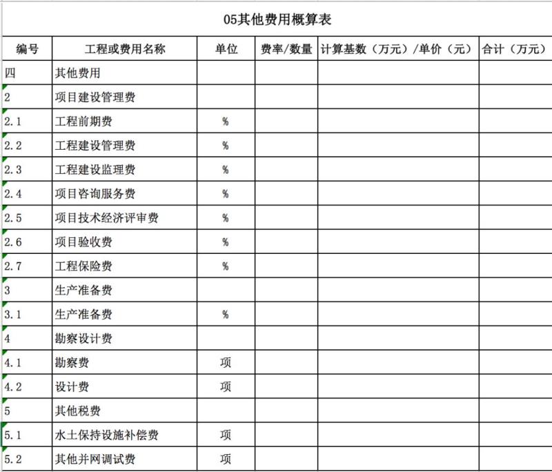 包含:工程前期費(fèi)、管理費(fèi)、監(jiān)理費(fèi)、保險(xiǎn)費(fèi)、驗(yàn)收費(fèi)、生產(chǎn)準(zhǔn)備金等等費(fèi)用。如下表所示。
