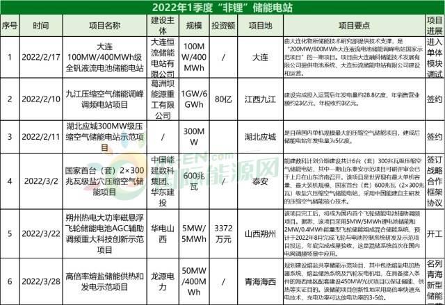 2022年一季度非鋰儲(chǔ)能電站匯總表