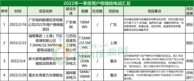 2022年一季度用戶側(cè)儲(chǔ)能電站匯總表