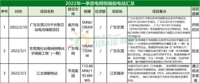2022年一季度電網(wǎng)側(cè)儲(chǔ)能電站匯總表