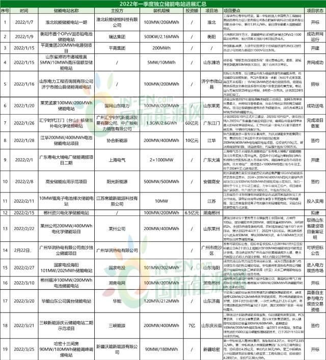 2022年一季度獨(dú)立儲(chǔ)能電站項(xiàng)目建設(shè)情況匯總表