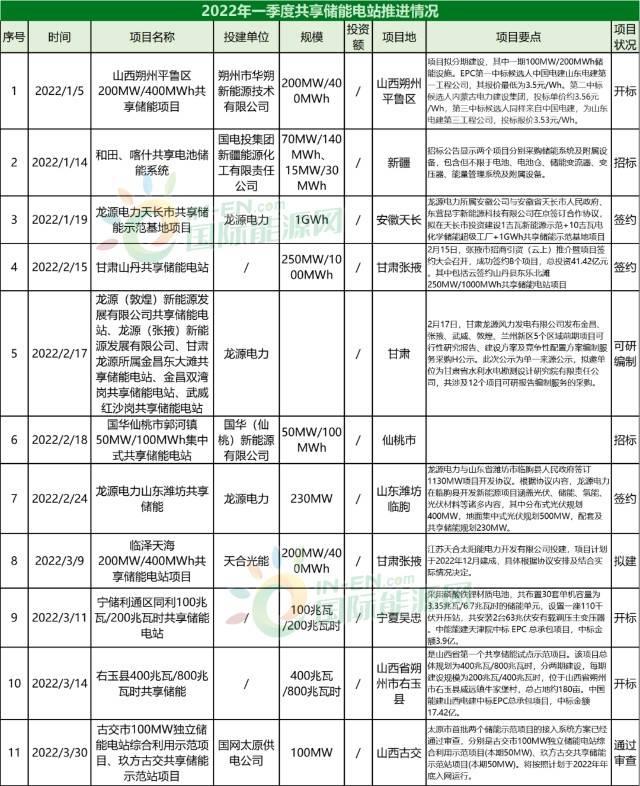 2022年一季度共享儲(chǔ)能電站推進(jìn)情況表