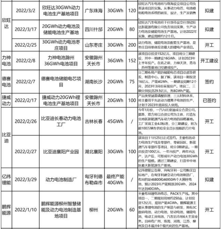 2022年一季度動(dòng)力電池項(xiàng)目匯總表