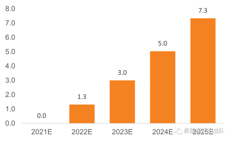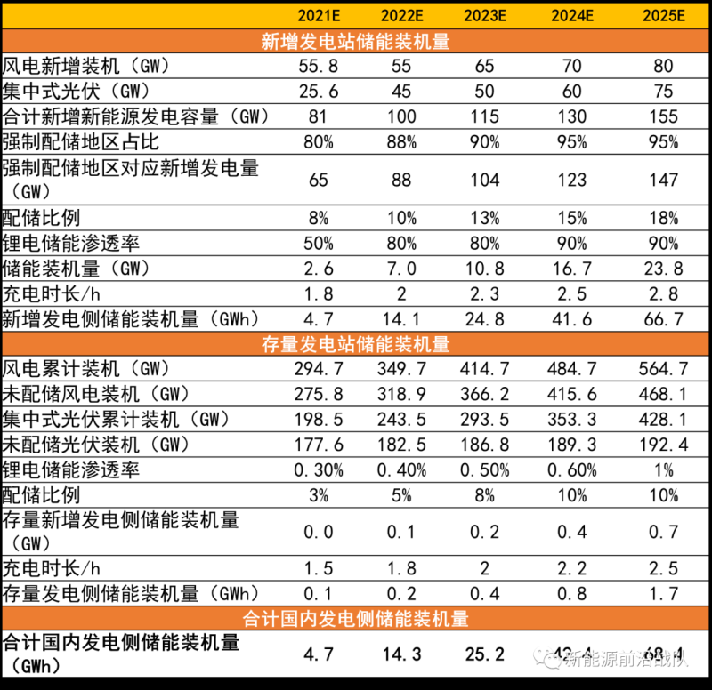 國內(nèi)新能源發(fā)電未配儲裝機(jī)量:基于20年未配儲新能源發(fā)電裝機(jī)量及21-25年新能源發(fā)電裝機(jī)量及發(fā)電側(cè)強(qiáng)配比例測算;