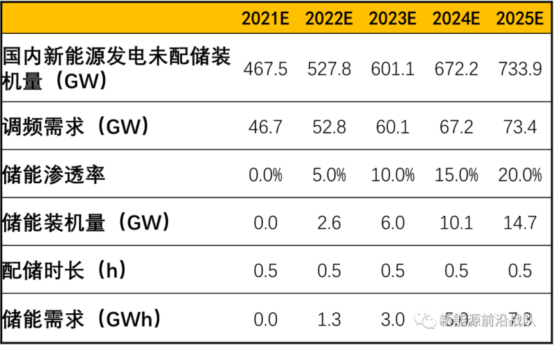 測算依據(jù):基于新能源發(fā)電未配儲裝機(jī)量。風(fēng)電、光伏等新能源發(fā)電不具備一次調(diào)頻能力,危害了電網(wǎng)的頻率安全和穩(wěn)定性,需要配備一次調(diào)頻能力(主要為加裝儲能)。因此,我們以國內(nèi)新能源發(fā)電未配儲部分裝機(jī)量為測算基準(zhǔn)。