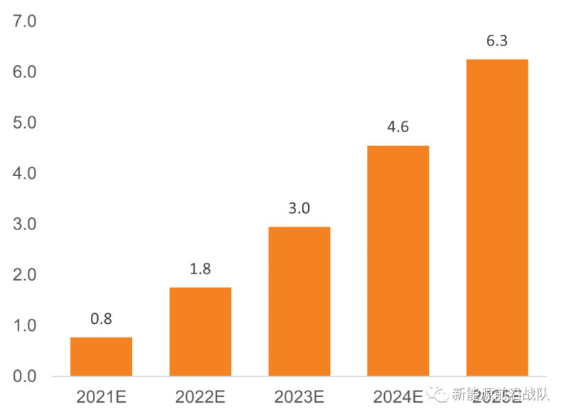 測算結(jié)果:基于調(diào)峰的儲能需求及考慮儲能年充放電時長,預(yù)計21-25年國內(nèi)調(diào)峰場景下儲能需求將為0.8/1.8/3.0/4.6/6.3GWh,4年CAGR+69%。
