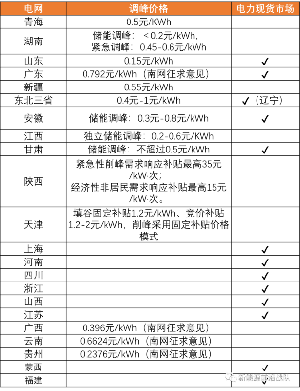 表:部分省(市)獨(dú)立儲能參與調(diào)峰的價格機(jī)制