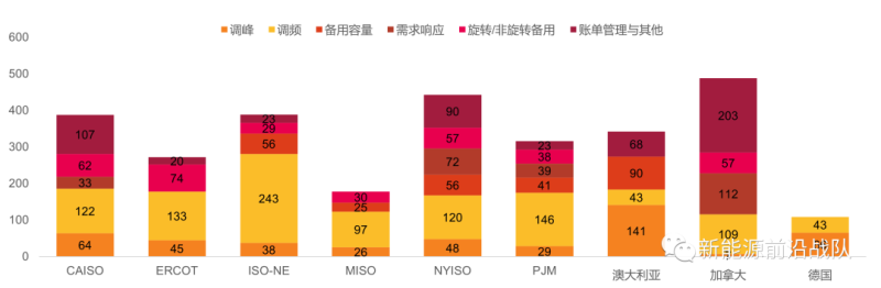 圖:調(diào)頻和調(diào)峰是國外電池儲能的主要應(yīng)用場景(美元/kW/年)