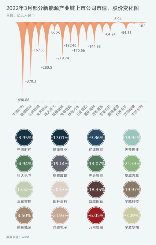 在整體回調(diào)行情中,新能源汽車(chē)產(chǎn)業(yè)鏈也未能幸免。3月,僅鵬輝能源(300438.SZ)市值微增6.94億元??拼笥嶏w(002230.SZ)、四維圖新(002405.SZ)、三花智控(002050.SZ)等布局新能源、智能化業(yè)務(wù)的供應(yīng)商市值分別下滑了4.94%、18.35%和17.32%。