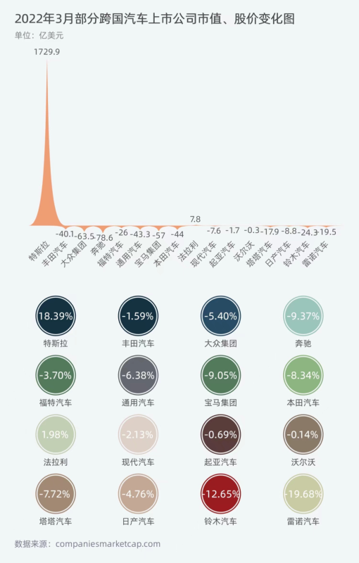海外市場(chǎng)的汽車(chē)上市公司中,“一枝獨(dú)秀”的造車(chē)新勢(shì)力特斯拉(TSLA)成為看點(diǎn)。3月股價(jià)上漲18.39%,市值增加了1729.9億美元。除此之外,還有法拉利(RACE)市值微增7.8億美元。