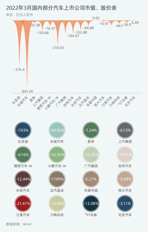 此外,長(zhǎng)城汽車(chē)(601633.SH)、江淮汽車(chē)(600418.SH)、北汽藍(lán)谷(600733.SH)和長(zhǎng)安汽車(chē)(000625.SZ)3月股價(jià)跌幅分別為24.95%、21.41%、17.89%和12.44%。其中,長(zhǎng)城汽車(chē)市值蒸發(fā)了841.39億元,成為3月A股受損最為嚴(yán)重的汽車(chē)上市公司。