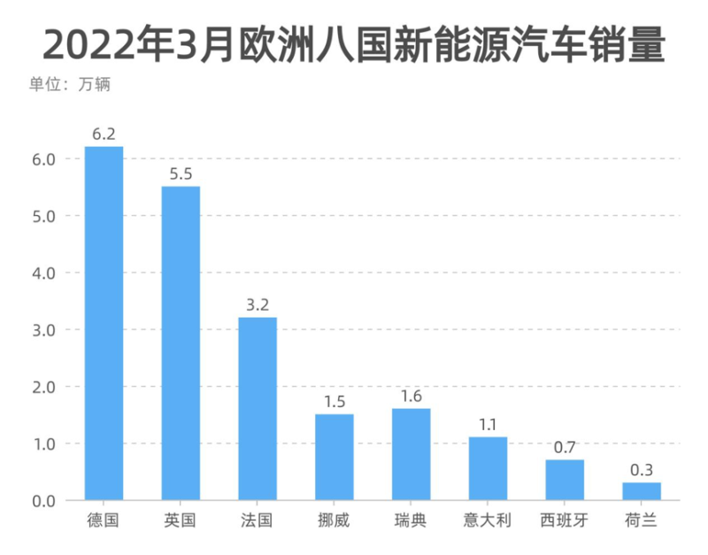 3月,在歐美市場(chǎng)中,新能源車(chē)出現(xiàn)回暖,德國(guó)、法國(guó)、挪威、英國(guó)、瑞典等九國(guó)純電動(dòng)車(chē)銷(xiāo)量合計(jì)銷(xiāo)量為20.3萬(wàn)輛,同比增長(zhǎng)6.1%。