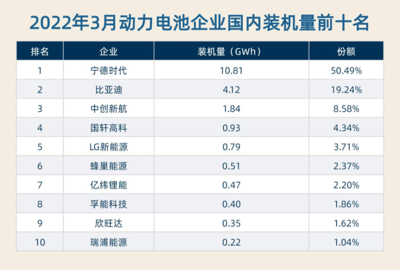 具體到動(dòng)力電池供應(yīng)商來(lái)看,3月,我國(guó)動(dòng)力電池裝機(jī)量排名前三的企業(yè)分別是寧德時(shí)代(300750.SZ)、比亞迪(002594.SZ)和中創(chuàng)新航。其中,僅寧德時(shí)代一家的動(dòng)力電池裝機(jī)量就占據(jù)一半以上的市場(chǎng)份額,其市占率較上月大增了2.47個(gè)百分點(diǎn)。
