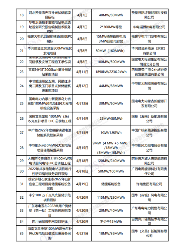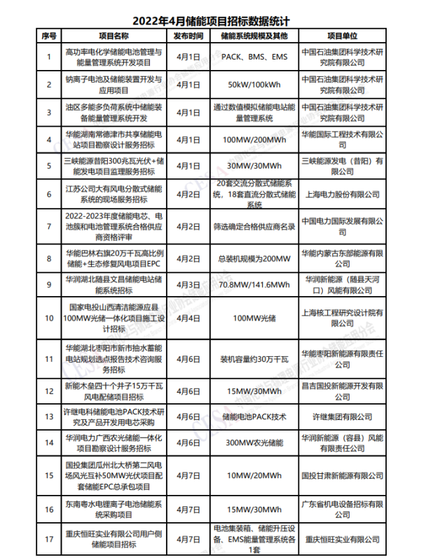 2022年4月份儲能項(xiàng)目招標(biāo)數(shù)據(jù)統(tǒng)計(jì)如下,供業(yè)界同仁參考: