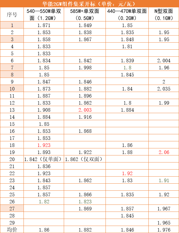 根據(jù)開標結(jié)果來看,標段一最低報價為1.82元/瓦,最高報價為1.923元/瓦,均由二線組件企業(yè)投出,整體均價為1.86元/瓦;標段二整體均價為1.882元/瓦,高出標段一約0.02元/瓦左右,最高報價已超出2元/瓦。標段三整體報價最低,均價為1.846元/瓦,最低價格來到了1.8元/瓦,由頭部組件企業(yè)報出。標段四由于為N型組件,整體報價最高,均價為1.976元/瓦,最低報價也達到了1.91元/瓦。