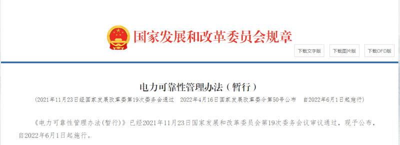 《電力可靠性管理辦法(暫行)》已經(jīng)2021年11月23日國家發(fā)展和改革委員會第19次委務(wù)會議審議通過,現(xiàn)予公布,自2022年6月1日起施行。