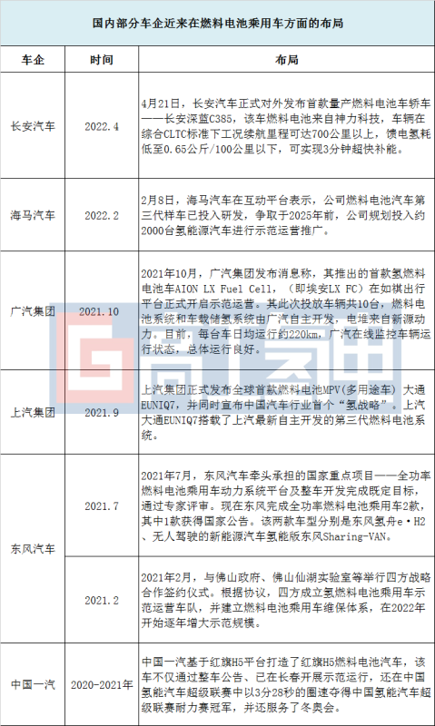 以下是去年以來國內(nèi)部分主流車企在燃料電池乘用車方面的推進(jìn)情況: