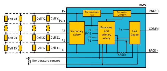 圖4顯示了一個典型的電池管理系統(tǒng)(BMS)示例。在這一設(shè)計中,每個電池單元(并聯(lián)電池組)的電壓由兩個獨立的組件(主要和次要安全)監(jiān)控。這兩個組件可以關(guān)閉放電或充電電流,熔斷不可復(fù)位的保險絲或激活保護MOSFET。溫度和電流(通過分流器測量)也受到監(jiān)控,如果溫度或電流超出電池的推薦電流和溫度范圍,安全組件可以中斷電流。