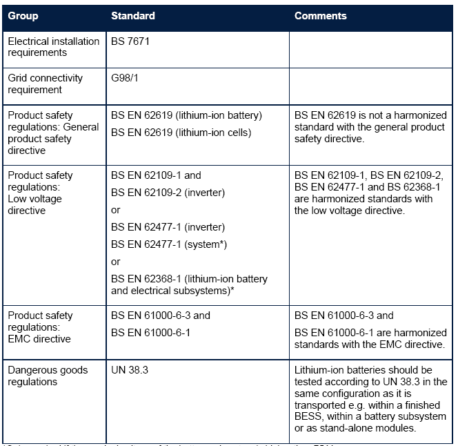 目前有幾項適用于英國鋰離子電池儲能系統(tǒng)的標準正在制定中,尚未公布。如果這些標準的開發(fā)旨在成為低壓指令或通用產(chǎn)品安全指令下的協(xié)調(diào)標準,或在其他標準或法規(guī)(如BS7671)中引用,則將有助于明確表明符合法規(guī)的過程。
