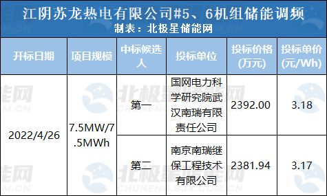 中國儲能網(wǎng)訊:4月25日,江陰蘇龍熱電有限公司發(fā)布#5、6機(jī)組儲能輔助調(diào)頻項(xiàng)目中標(biāo)候選人公示。其中第一候選人為國網(wǎng)電力科學(xué)研究院武漢南瑞有限責(zé)任公司,儲能單價(jià)3.18元/Wh,第二候選人為南京南瑞繼保工程技術(shù)有限公司,儲能單價(jià)3.17元/Wh。