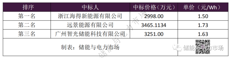 浙江海得新能源有限公司以2998萬元成為第一中標(biāo)人,折合單價(jià)1.50元/Wh。