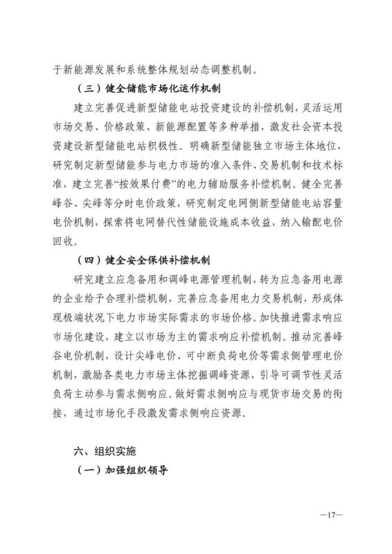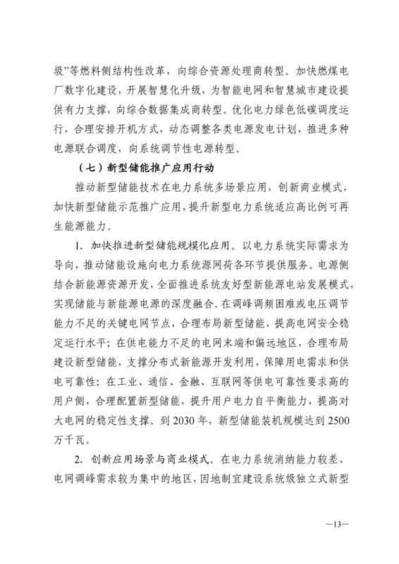 1、加快推進新型儲能規(guī)模化應(yīng)用。以電力系統(tǒng)實際需求為導向,推動儲能設(shè)施向電力系統(tǒng)源網(wǎng)荷各環(huán)節(jié)提供服務(wù)。電源側(cè)結(jié)合新能源資源開發(fā),全面推進系統(tǒng)友好型新能源電站發(fā)展模式,實現(xiàn)儲能與新能源電源的深度融合。在調(diào)峰調(diào)頻困難或電壓調(diào)節(jié)能力不足的關(guān)鍵電網(wǎng)節(jié)點,合理布局新型儲能,提高電網(wǎng)安全穩(wěn)定運行水平;在供電能力不足的電網(wǎng)末端和偏遠地區(qū),合理布局建設(shè)新型儲能,支撐分布式新能源開發(fā)利用,保障用電需求和供電可靠性;在工業(yè)、通信、金融、互聯(lián)網(wǎng)等供電可靠性要求高的用戶側(cè),合理配置新型儲能,提升用戶電力自平衡能力,提高對大電網(wǎng)的穩(wěn)定性支撐。到2030年,新型儲能裝機規(guī)模達到 2500萬千瓦。