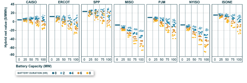 圖7.電池儲(chǔ)能容量(x軸)和持續(xù)時(shí)間(圖例)對(duì)太陽(yáng)能+儲(chǔ)能項(xiàng)目?jī)糁档挠绊?