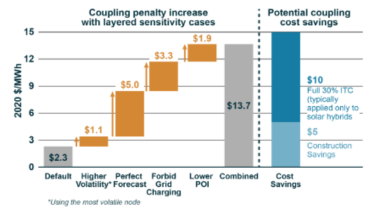 研究中計(jì)算出粗略的成本節(jié)約為15美元/MWh,其中10美元來(lái)自獲得的30%的投資稅收抵免(ITC),5美元來(lái)自建設(shè)成本節(jié)約——這兩者都高于默認(rèn)的耦合損失。但是,如果電池儲(chǔ)能系統(tǒng)僅從共址部署的可再生能源發(fā)電設(shè)施充電,如果互連容量受限于可再生能源發(fā)電設(shè)施的規(guī)模,并且儲(chǔ)能系統(tǒng)調(diào)度能夠以完美的預(yù)見(jiàn)性運(yùn)行,則耦合損失可能會(huì)增加到14美元/MWh?;旌喜渴痦?xiàng)目的耦合損失和成本節(jié)約的不確定性表明,獨(dú)立部署和混合部署項(xiàng)目的開(kāi)發(fā)模型都是可行的。