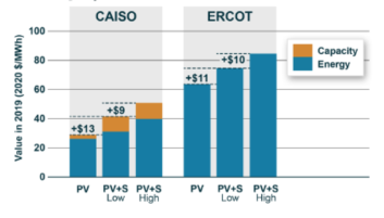 為了查看圖4中顯示的電力采購(gòu)協(xié)議(PPA)的價(jià)格加法器是否有意義,伯克利實(shí)驗(yàn)室對(duì)加州獨(dú)立系統(tǒng)運(yùn)營(yíng)商(CAISO)和德州電力可靠性委員會(huì)(ERCOT)的獨(dú)立部署太陽(yáng)能發(fā)電設(shè)施配套電池儲(chǔ)能系統(tǒng)的價(jià)值進(jìn)行了建模,電池儲(chǔ)能系統(tǒng)的裝機(jī)容量為太陽(yáng)能發(fā)電設(shè)施裝機(jī)容量的一半,持續(xù)時(shí)間4小時(shí)(如圖5所示)。這種配置應(yīng)該使電力采購(gòu)協(xié)議(PPA)價(jià)格增加8~13美元/MWh。當(dāng)然,在電力采購(gòu)協(xié)議(PPA)的整個(gè)生命周期內(nèi),混合部署項(xiàng)目的價(jià)值會(huì)有所不同,但至少在最近幾年,并且在聯(lián)邦投資稅收抵免(ITC)的幫助下,增加的增值似乎證明價(jià)格溢價(jià)是合理的。