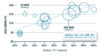 17個(gè)電力采購(gòu)協(xié)議(PPA)的子樣本將太陽(yáng)能+儲(chǔ)能項(xiàng)目各組件的價(jià)格分開(kāi),能夠準(zhǔn)確計(jì)算儲(chǔ)能系統(tǒng)電力采購(gòu)協(xié)議(PPA)價(jià)格增加了多少。這種“平準(zhǔn)化儲(chǔ)能價(jià)格加法器”隨著電池儲(chǔ)能系統(tǒng)與太陽(yáng)能發(fā)電設(shè)施容量的比率線性增加(圖4),這也是夏威夷州的混合部署項(xiàng)目(所有電池儲(chǔ)能系統(tǒng)都相對(duì)規(guī)模較大)價(jià)格高于圖中其他州的幾個(gè)原因之一。