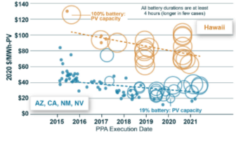 在伯克利實(shí)驗(yàn)室的公用事業(yè)規(guī)模電力采購(gòu)協(xié)議(PPA)的價(jià)格樣本中,太陽(yáng)能+儲(chǔ)能混合部署項(xiàng)目的價(jià)格(美元/MWh)(在圖3中以反映電池儲(chǔ)能系統(tǒng)與太陽(yáng)能發(fā)電設(shè)施裝機(jī)容量比的空心圓圈顯示)接近獨(dú)立部署的太陽(yáng)能發(fā)電設(shè)施價(jià)格(較小實(shí)心圓圈)。因此,隨著時(shí)間的推移,太陽(yáng)能+儲(chǔ)能的項(xiàng)目將變得越來(lái)越普遍。而在夏威夷州(橙色),在2017年之后,幾乎所有簽署電力采購(gòu)協(xié)議(PPA)的公用事業(yè)規(guī)模太陽(yáng)能發(fā)電設(shè)施都配套部署電池儲(chǔ)能系統(tǒng),并且這種平衡似乎在顯示的其他四個(gè)州(藍(lán)色)之間發(fā)生了變化。這些電力采購(gòu)協(xié)議(PPA) 平準(zhǔn)化價(jià)格反映了美國(guó)聯(lián)邦投資稅收抵免(ITC)的激勵(lì)情況。