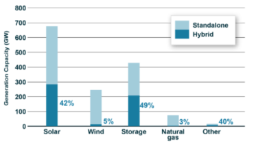 電池價(jià)格下降和可再生能源發(fā)電量的增長(zhǎng)正在推動(dòng)對(duì)混合部署項(xiàng)目的興趣激增。當(dāng)前開(kāi)發(fā)商的興趣主要集中在將太陽(yáng)能發(fā)電設(shè)施與電池儲(chǔ)能系統(tǒng)配套部署,但儲(chǔ)能裝系統(tǒng)可以與多種可再生能源發(fā)電設(shè)施配套部署。