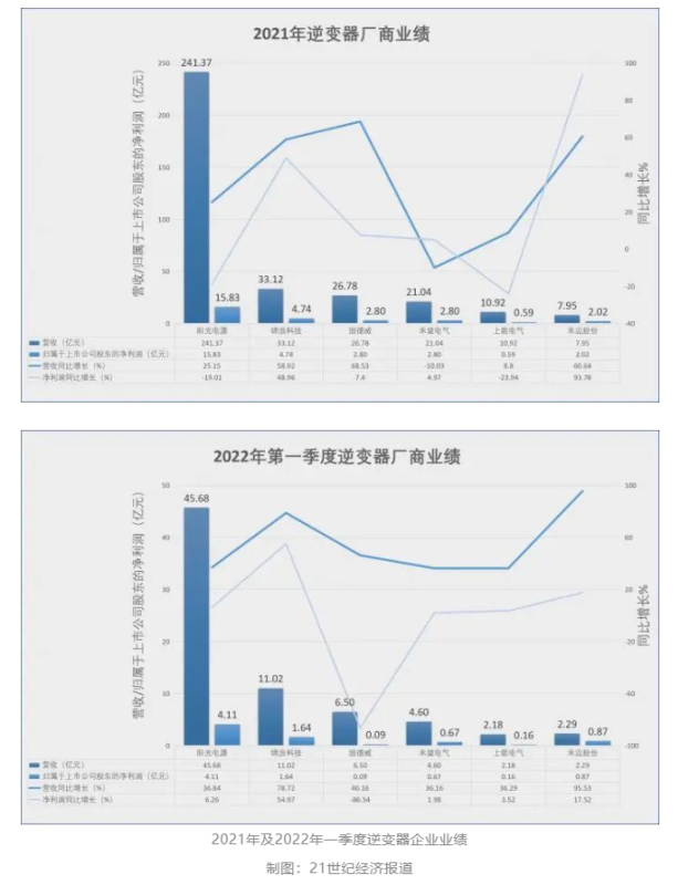 但在市場(chǎng)震蕩下,2021年逆變器板塊的成績(jī)單則反映出行業(yè)的盈利式微——盡管年內(nèi)產(chǎn)銷(xiāo)兩旺,但市場(chǎng)的激烈競(jìng)爭(zhēng)令企業(yè)利潤(rùn)受到壓縮,機(jī)構(gòu)資金回撤使得龍頭股的風(fēng)采不再。