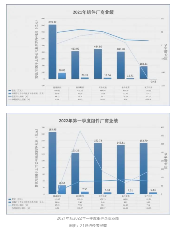 就出貨能力而言,2021年,國(guó)內(nèi)幾大組件廠商出貨量創(chuàng)下歷史新高,且向頭部集中。今年,組件的市場(chǎng)需求將進(jìn)一步擴(kuò)大,且業(yè)績(jī)反彈較為明顯。