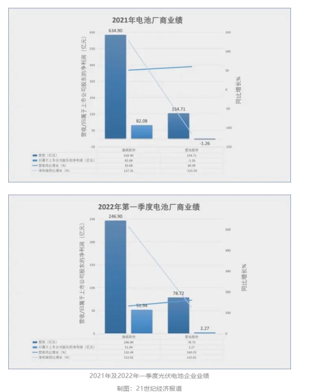 2021年,兩家主力光伏電池公司通威股份、愛(ài)旭股份電池業(yè)務(wù)分別實(shí)現(xiàn)營(yíng)業(yè)收入超過(guò)240億元、153億元,在銷(xiāo)售量增長(zhǎng)的推動(dòng)下,銷(xiāo)售額雙雙提升。然而,兩家電池龍頭共同面臨的處境是,毛利率均出現(xiàn)嚴(yán)重下滑——通威股份電池業(yè)務(wù)毛利率為8.81%,較2020年減少5.73個(gè)百分點(diǎn);愛(ài)旭股份電池業(yè)務(wù)毛利率為5.43%,較2020年減少9.07個(gè)百分點(diǎn)。