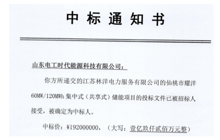 中國儲能網(wǎng)訊:4月24日,山東電工時代能源科技有限公司(以下簡稱“電工時代”)中標(biāo)仙桃市耀洋60MW/120MWh集中式(共享式)儲能項目,中標(biāo)金額1.92億元,儲能業(yè)績累計突破1GWh!