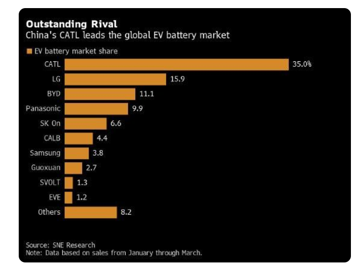 分析師指出,韓國廠商市場份額的下降與中國公司的進步形成了鮮明對比,包括領(lǐng)先的寧德時代(其份額從去年同期的 28.5% 急劇上升至 35%)。