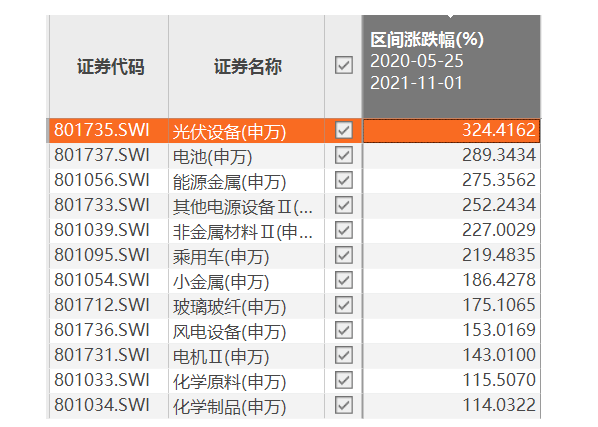 上圖是在大盤技術(shù)性回調(diào)前,申萬一級行業(yè)板塊從2020年年中至2021年年底的區(qū)間行情,可見,電力設備獨占鰲頭,以186%的漲幅領(lǐng)跑;而根據(jù)申萬二級行業(yè)中,光伏設備板塊的表現(xiàn)更是“皇冠上的明珠”,以320%左右的漲幅跑贏了近兩年的大熱門板塊鋰電池。
