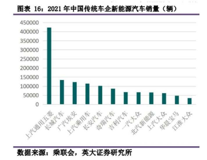 據(jù)英大證券研究所數(shù)據(jù)顯示,2021年銷量前十五名新能源車企中,傳統(tǒng)車企占據(jù)十個(gè)席位,比重已越來(lái)越大。