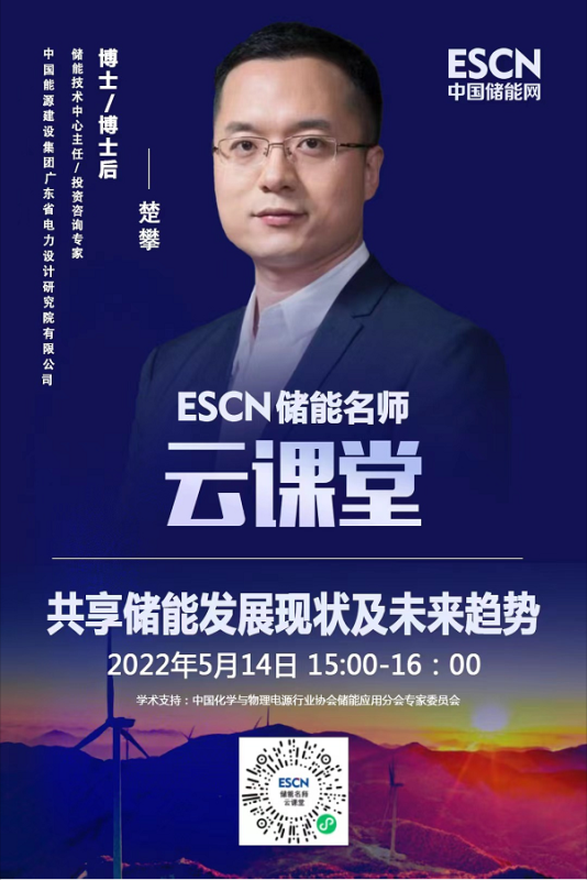 5月14日下午15:00-16:00,中國儲能網(wǎng)非常榮幸地邀請到國能源建設集團廣東省電力設計研究院有限公司儲能技術中心主任兼設計總工程師做客“ESCN儲能名師云課堂”(在線直播),為大家分享《共享儲能發(fā)展現(xiàn)狀及未來趨勢》主題報告。歡迎業(yè)界同仁在線學習與交流。